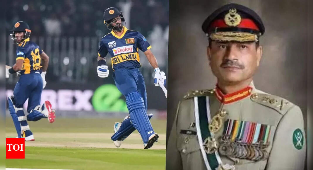 श्रीलंकेचा कामिल मिश्रा, मध्यभागी, आणि पथुम निसांका, डावीकडे, विकेट्सच्या (डावीकडे) आणि पाक लष्कर प्रमुख असीम मुनीर