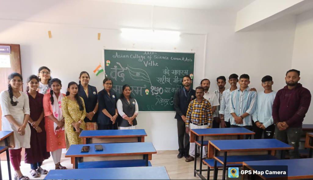 राजगड दि 07 : ​भारतीय स्वातंत्र्य लढ्याला प्रेरणा देणाऱ्या आणि प्रत्येक भारतीयाच्या मनात देशाभिमान जागृत करणाऱ्या राष्ट्रीय गीत ‘वंदे मातरम’ ला १५० वर्षे पूर्ण झाल्याच्या निमित्ताने आज एशियन कॉलेज ऑफ सायन्स, कॉमर्स अँड आर्ट्स, वेल्हे येथे विशेष कार्यक्रमाचे आयोजन करण्यात आले होते.